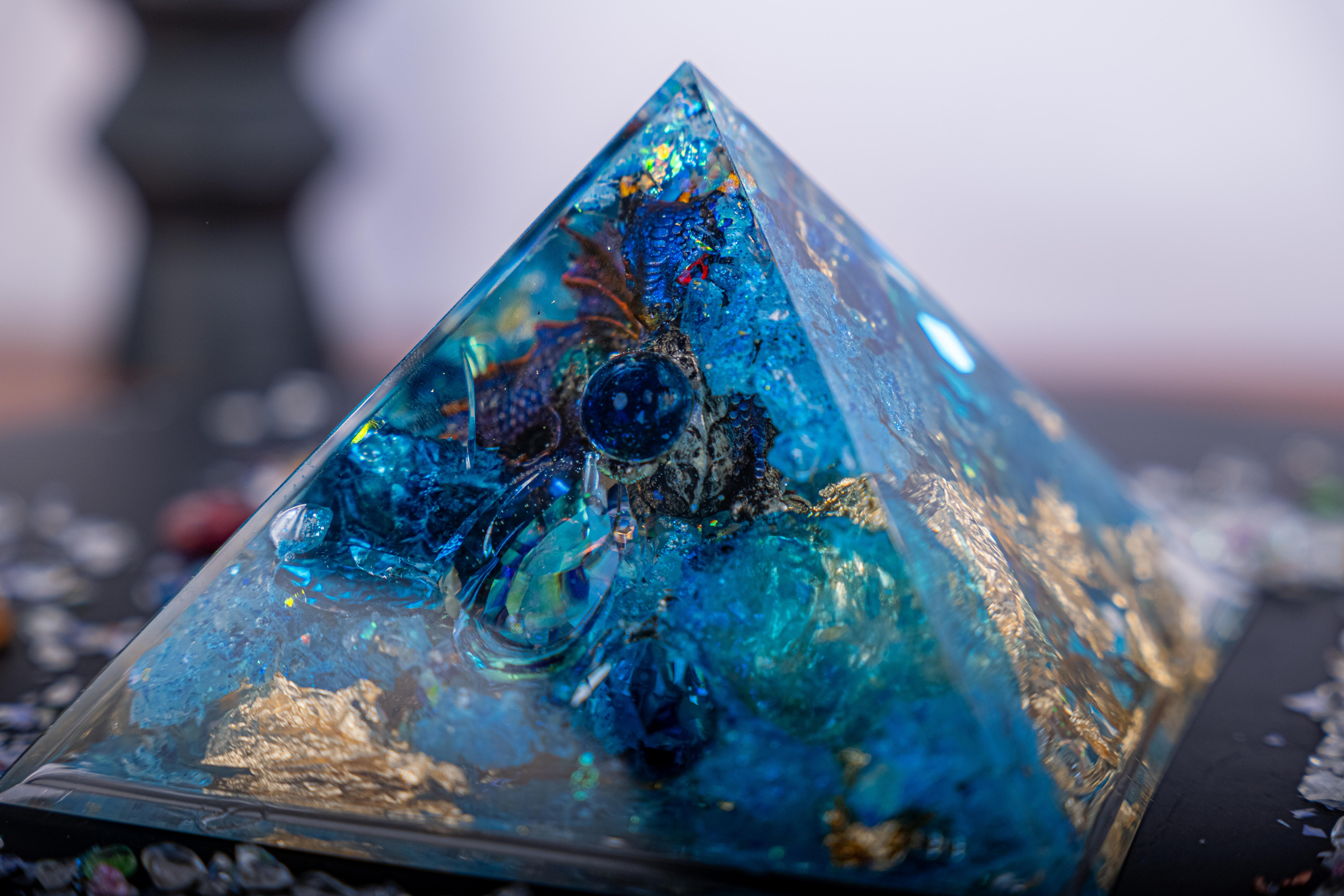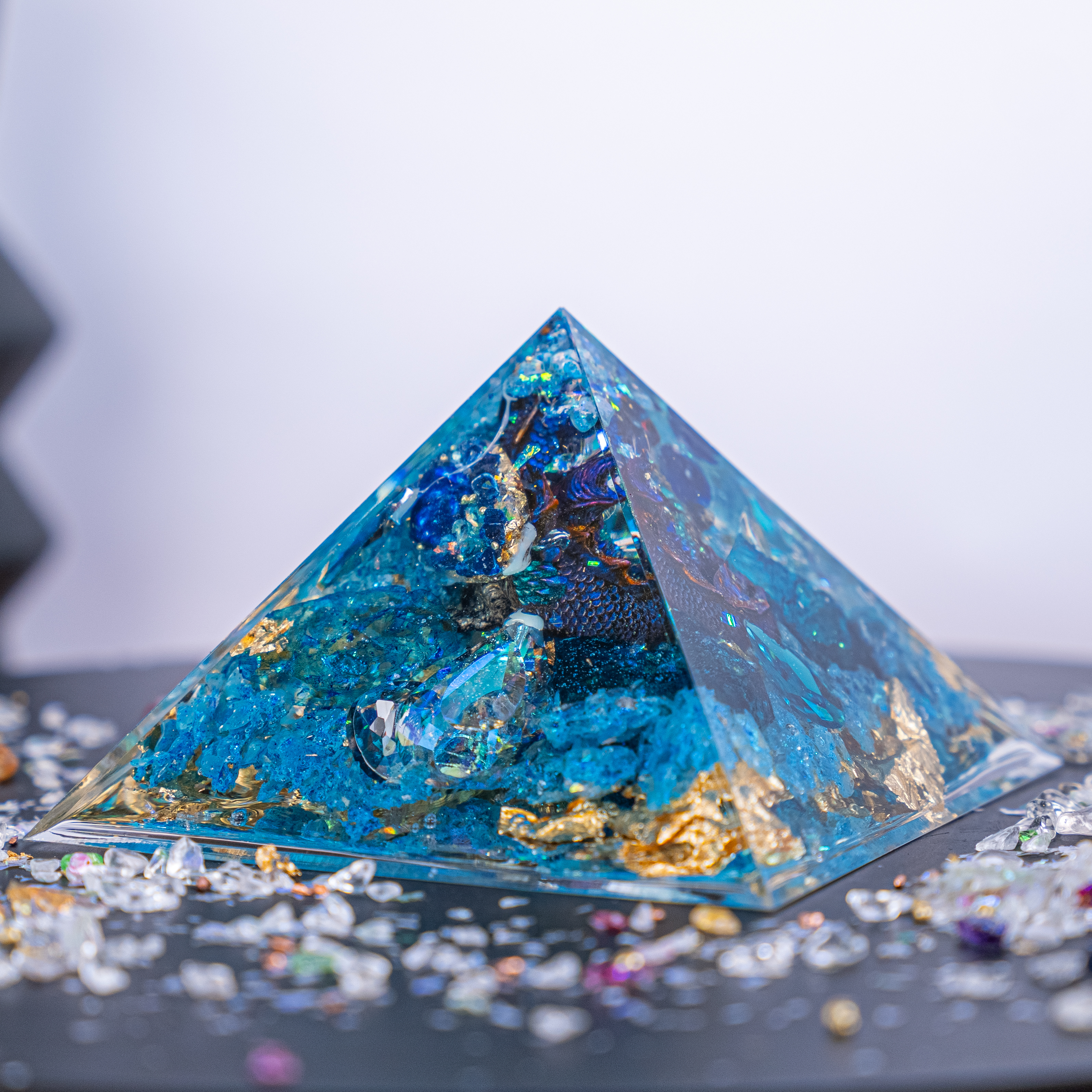 The Pranacrystal® Premium Water Dragon is a tribute to the flowing energy of water and the mystical presence of a dragon. This pyramid is more than just a piece of art; it is a symbol of transformation, strength, and wisdom. Carefully selected high-quality gemstones that resonate with the energy of water have been alchemically integrated into this pyramid. Additionally, artistic glitter elements have been added to reflect the play of light in water.