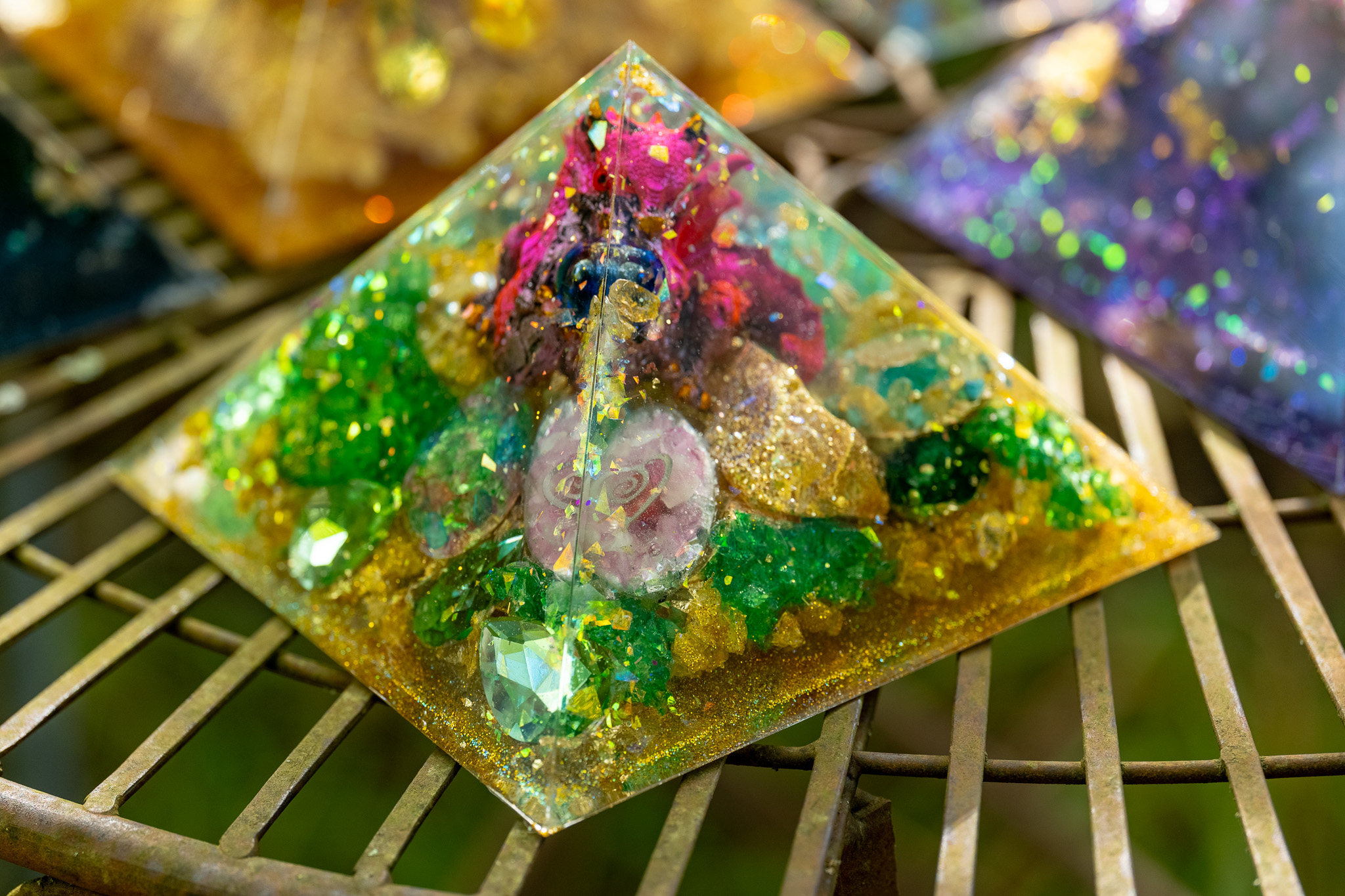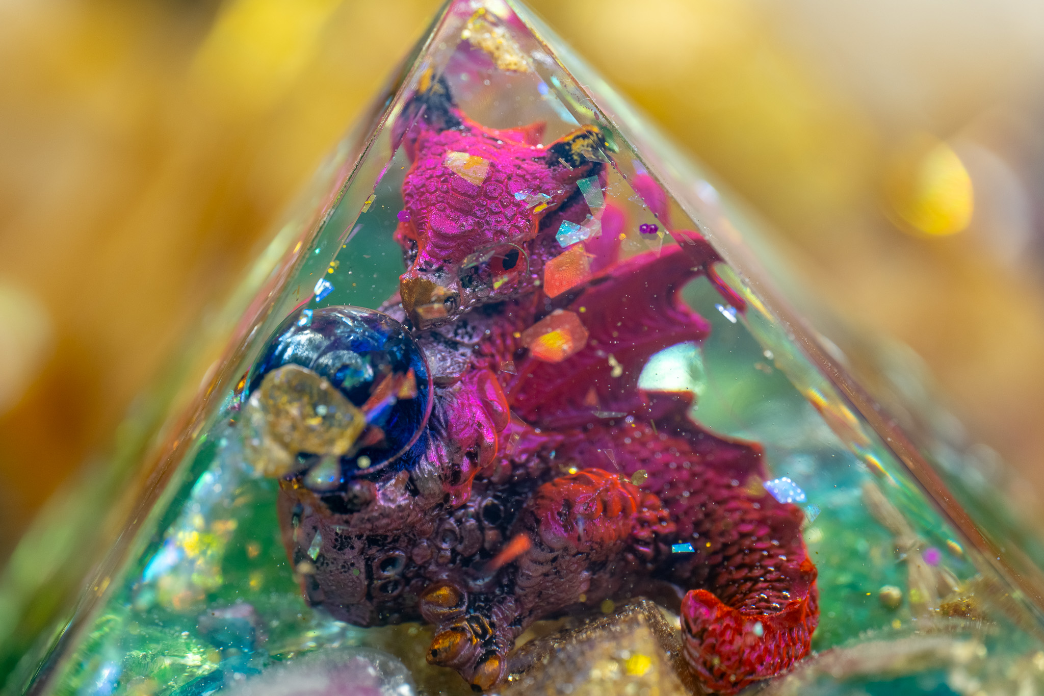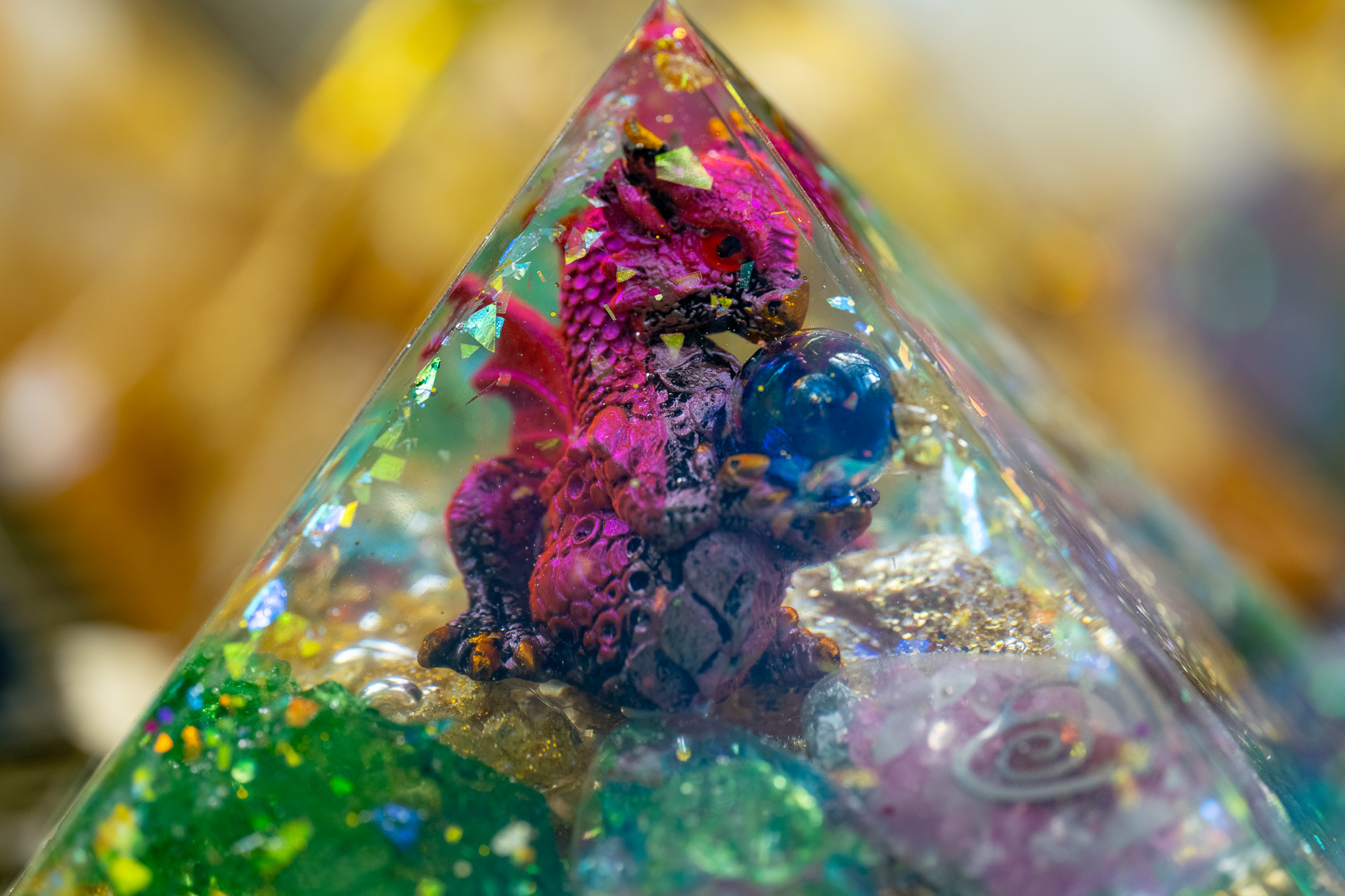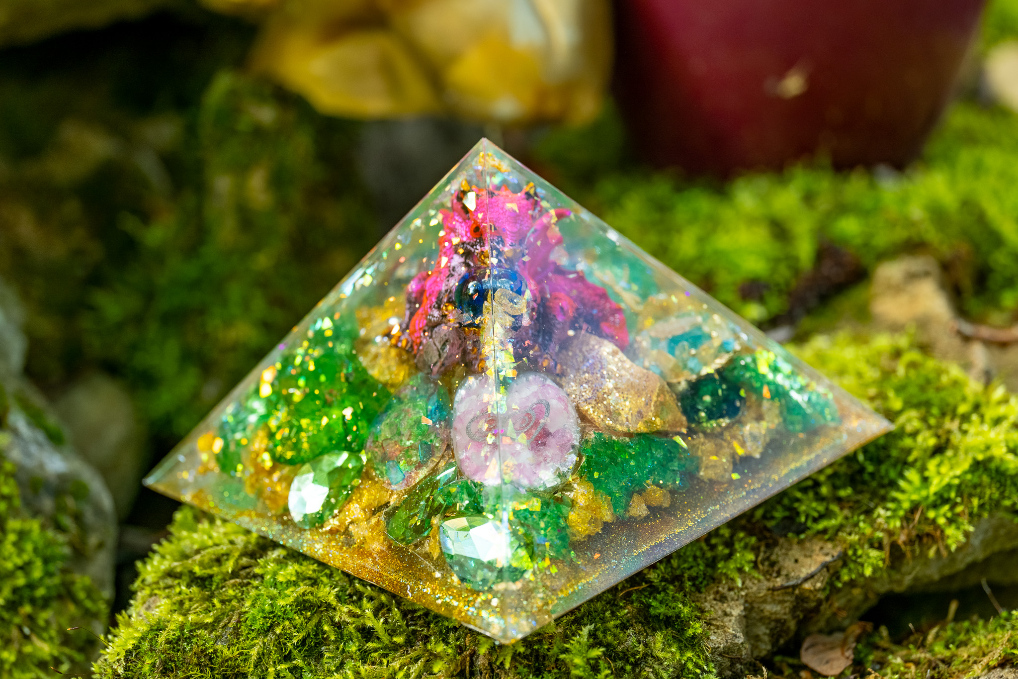The Pranacrystal® Red Dragon of Passion is more than just a piece of art – it is a symbol of passion, energy, and zest for life. High-quality gemstones and ruby particles that resonate with the energy of the red dragon have been carefully incorporated into this pyramid. Additionally, artistic red glitter elements shine on its surface, capturing the light and reflecting it like glowing sparks.