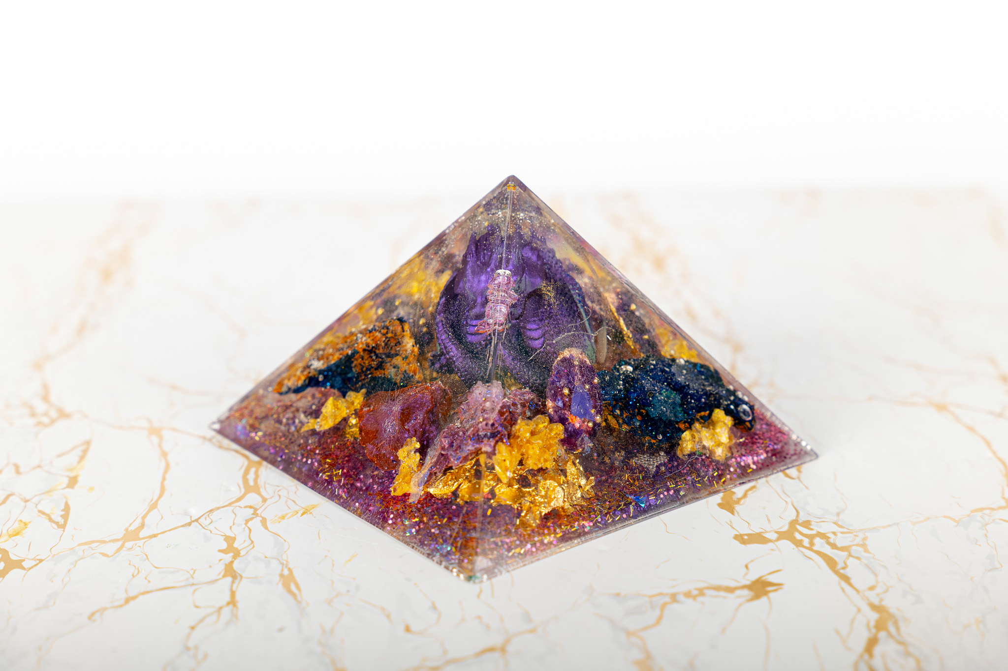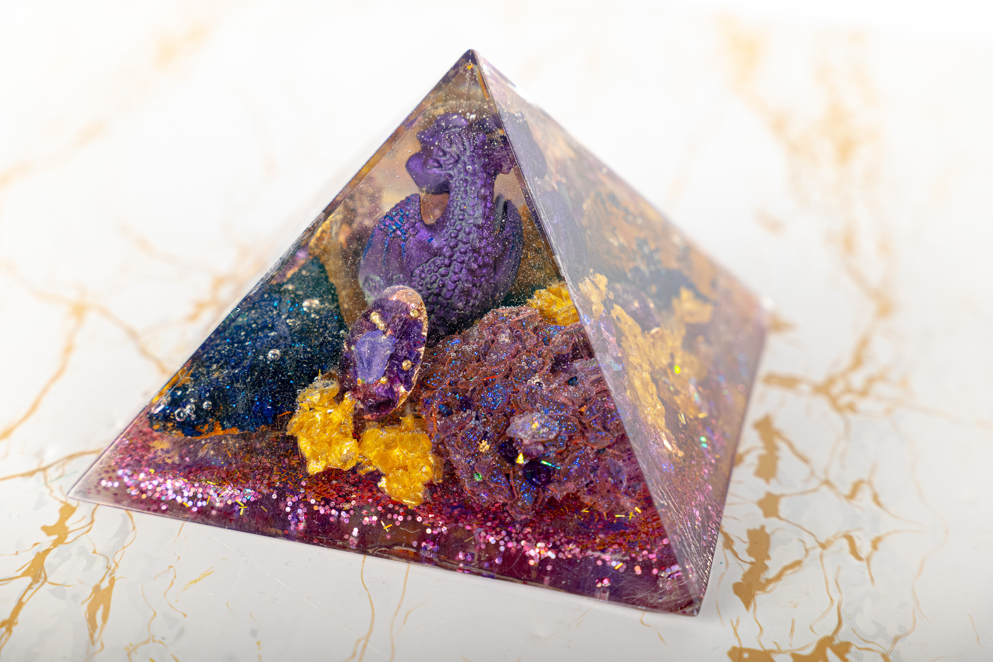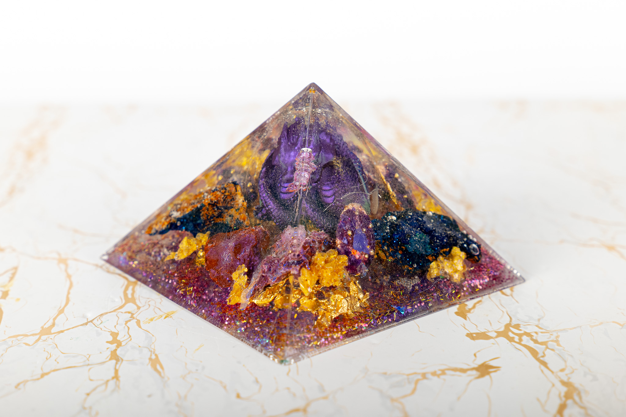 The Pranacrystal® Premium Violet Dragon of Transformation is not just a piece of art – it is a symbol of change, growth, and inner development. Carefully selected gemstones that resonate with the violet dragon energy have been alchemically integrated into this pyramid. Additionally, artistic glitter elements shine on its surface, capturing and reflecting light like shimmering jewels.