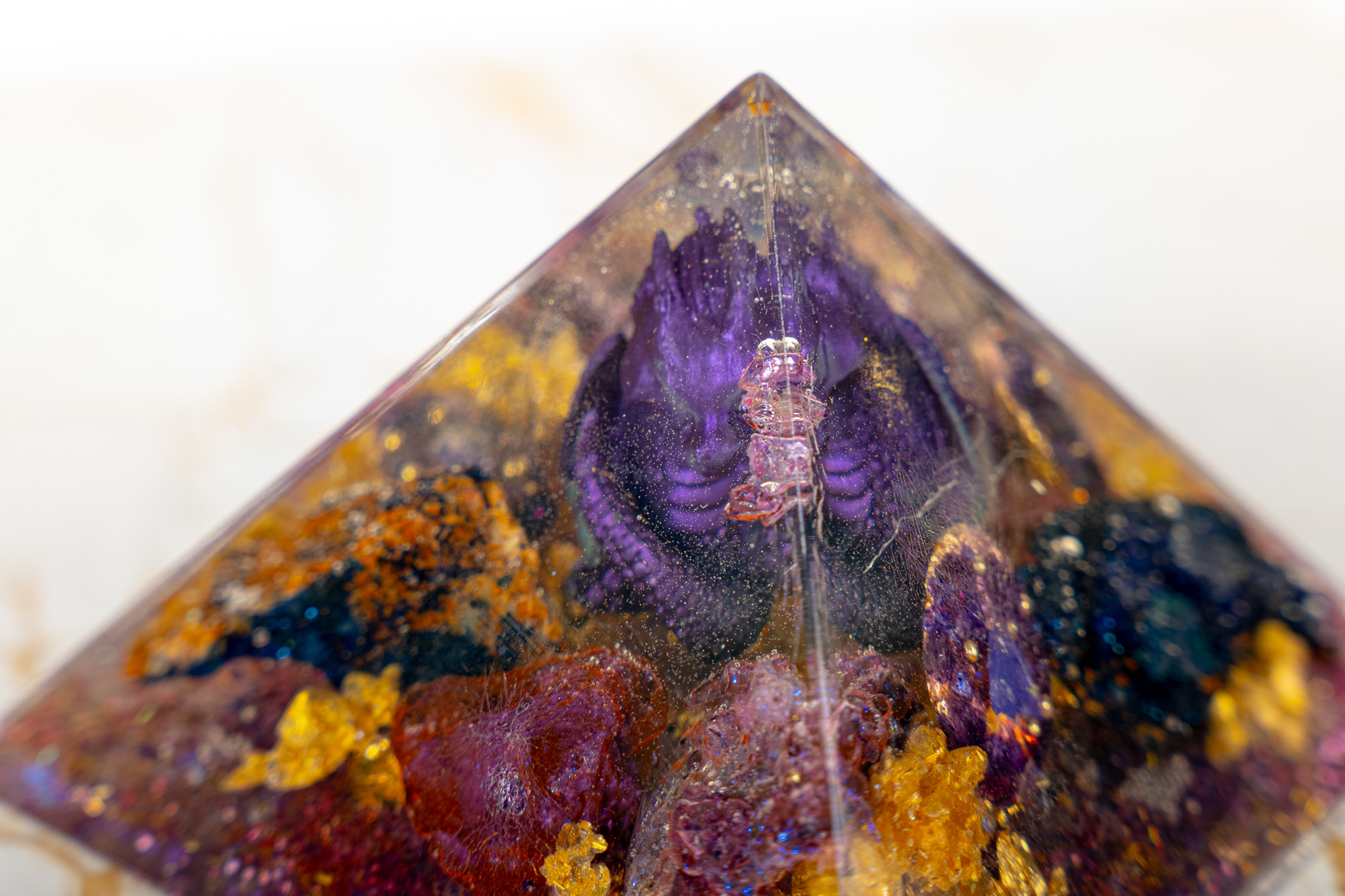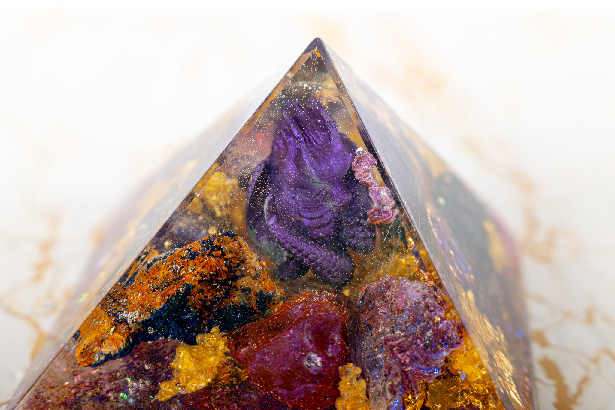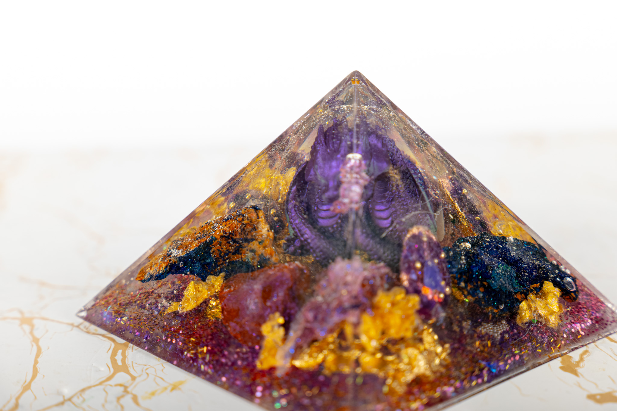 The Pranacrystal® Premium Violet Dragon of Transformation is not just a piece of art – it is a symbol of change, growth, and inner development. Carefully selected gemstones that resonate with the violet dragon energy have been alchemically integrated into this pyramid. Additionally, artistic glitter elements shine on its surface, capturing and reflecting light like shimmering jewels.