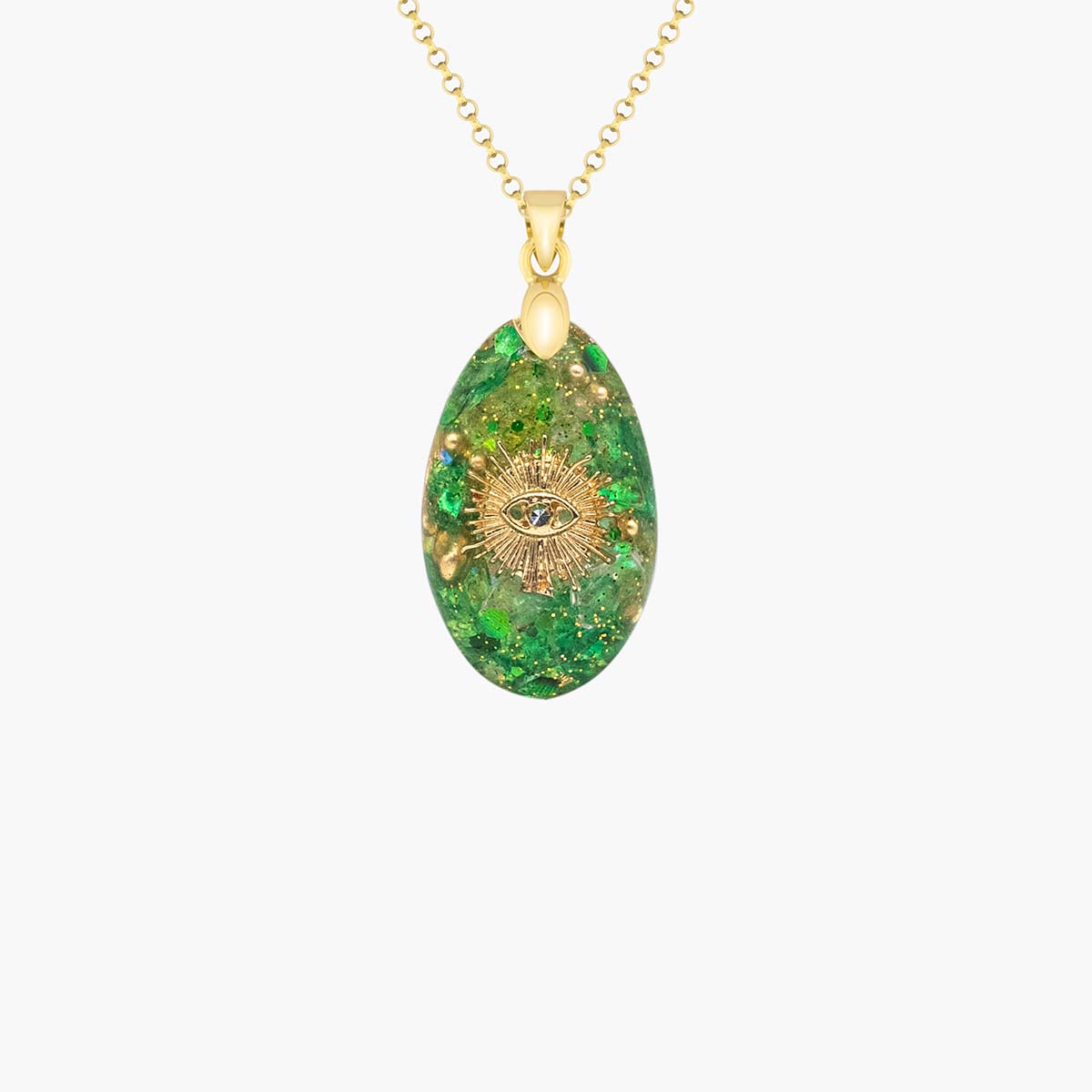 This unique Pranadrop combines the energy of the Eye of God with our orgonite technology. The radiant, brilliant clear quartz crystals strengthen our connection to God and the infinite universe. The shining eye at the center is surrounded by colored stones representing the powerful forces of the Archangels. Discover the cosmic intelligence within you – with this wonderful companion for your daily life.