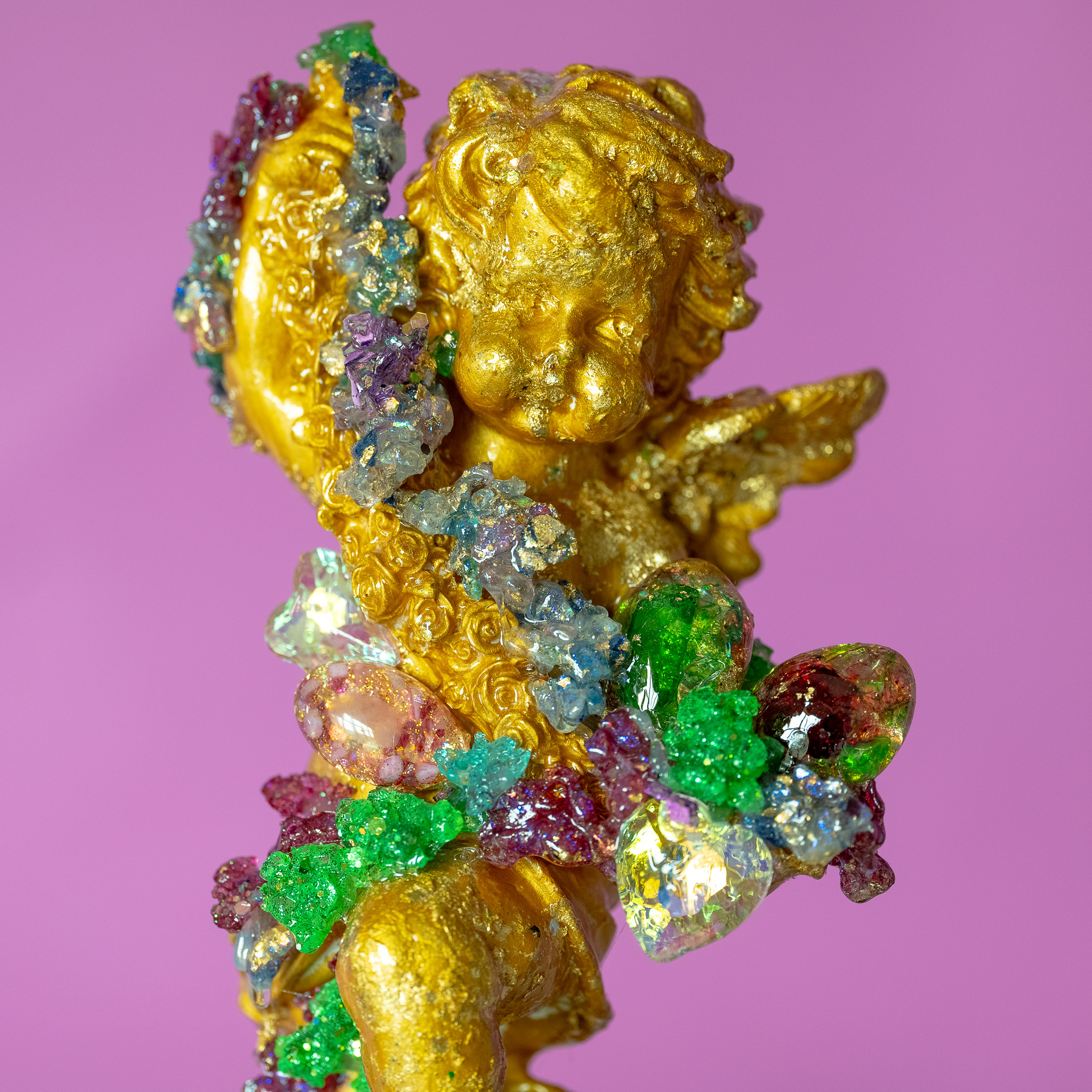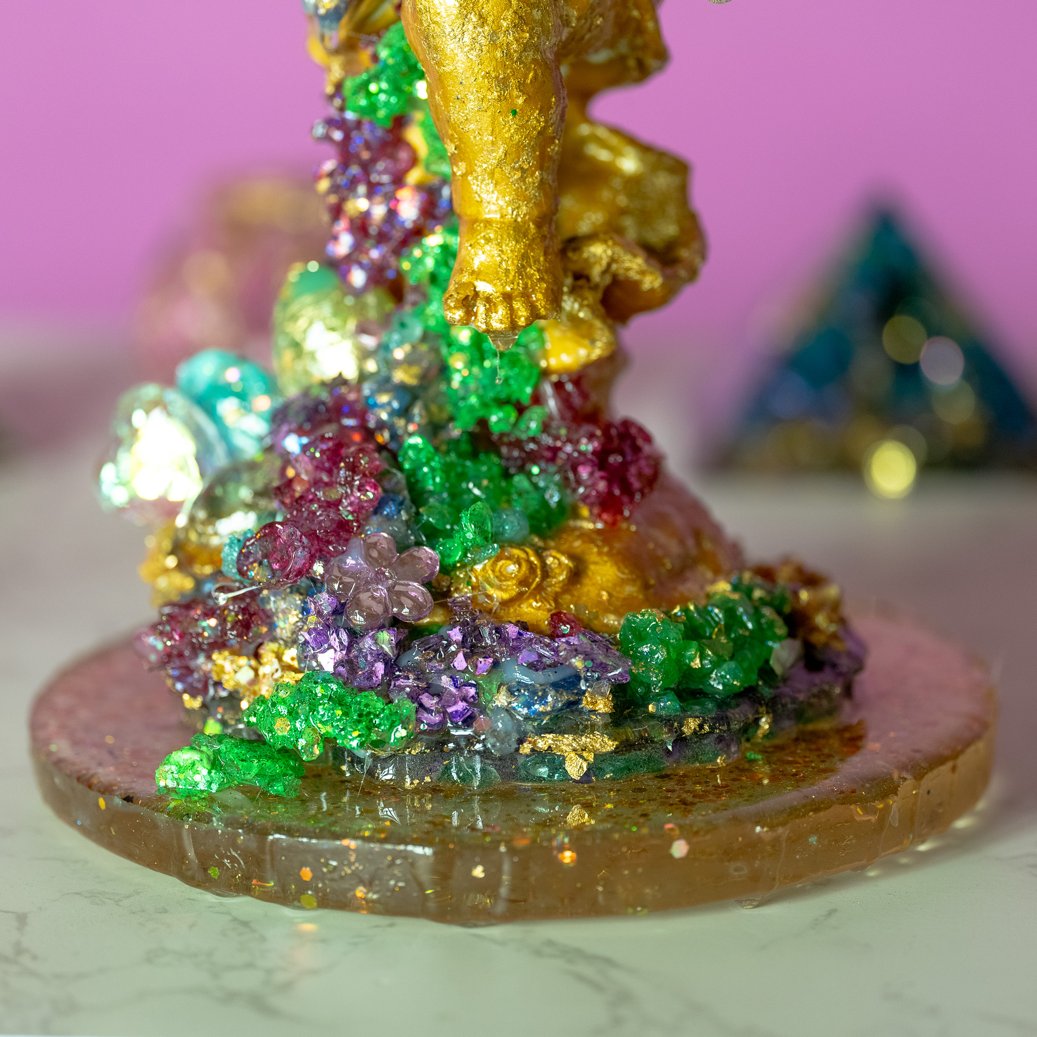 Der goldene Engel erhebt sich aus einer Basis aus schimmerndem Kunstharz, umgeben von einem Meer aus funkelnden Kristallen in Grün, Violett und Blau. Jede Facette reflektiert das Licht auf einzigartige Weise und erinnert an Metatrons göttliche Verbindung zwischen Himmel und Erde.
