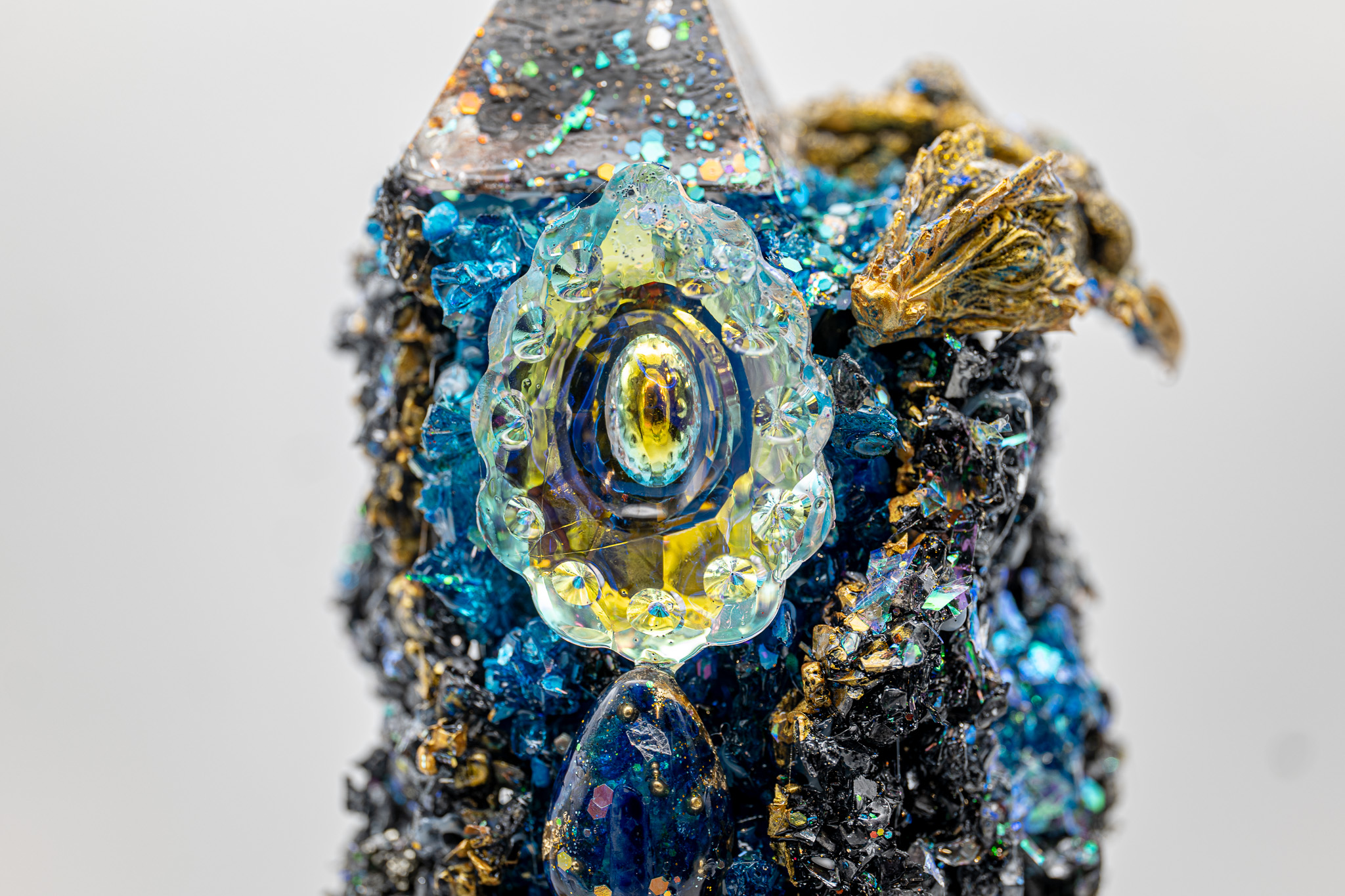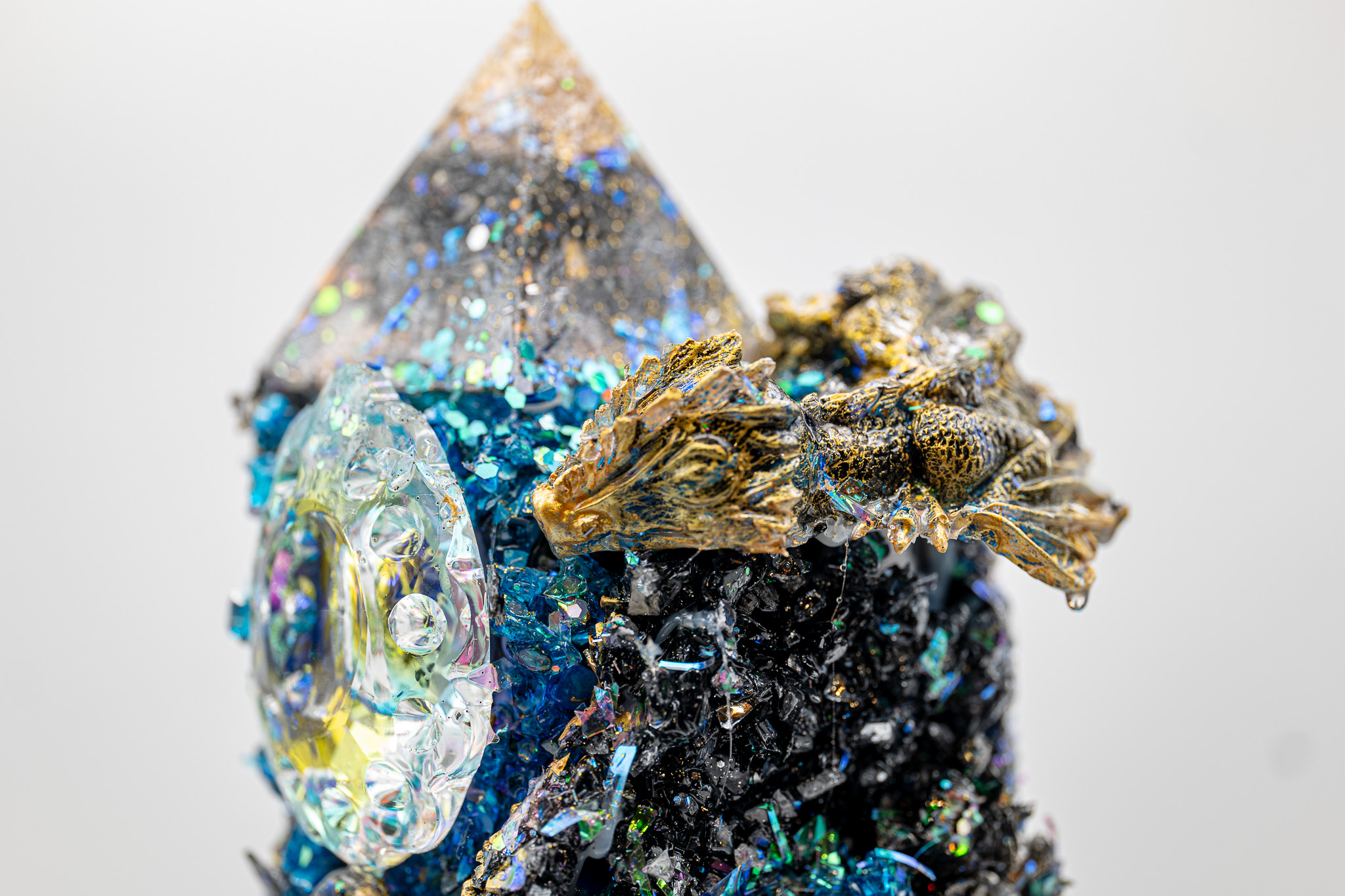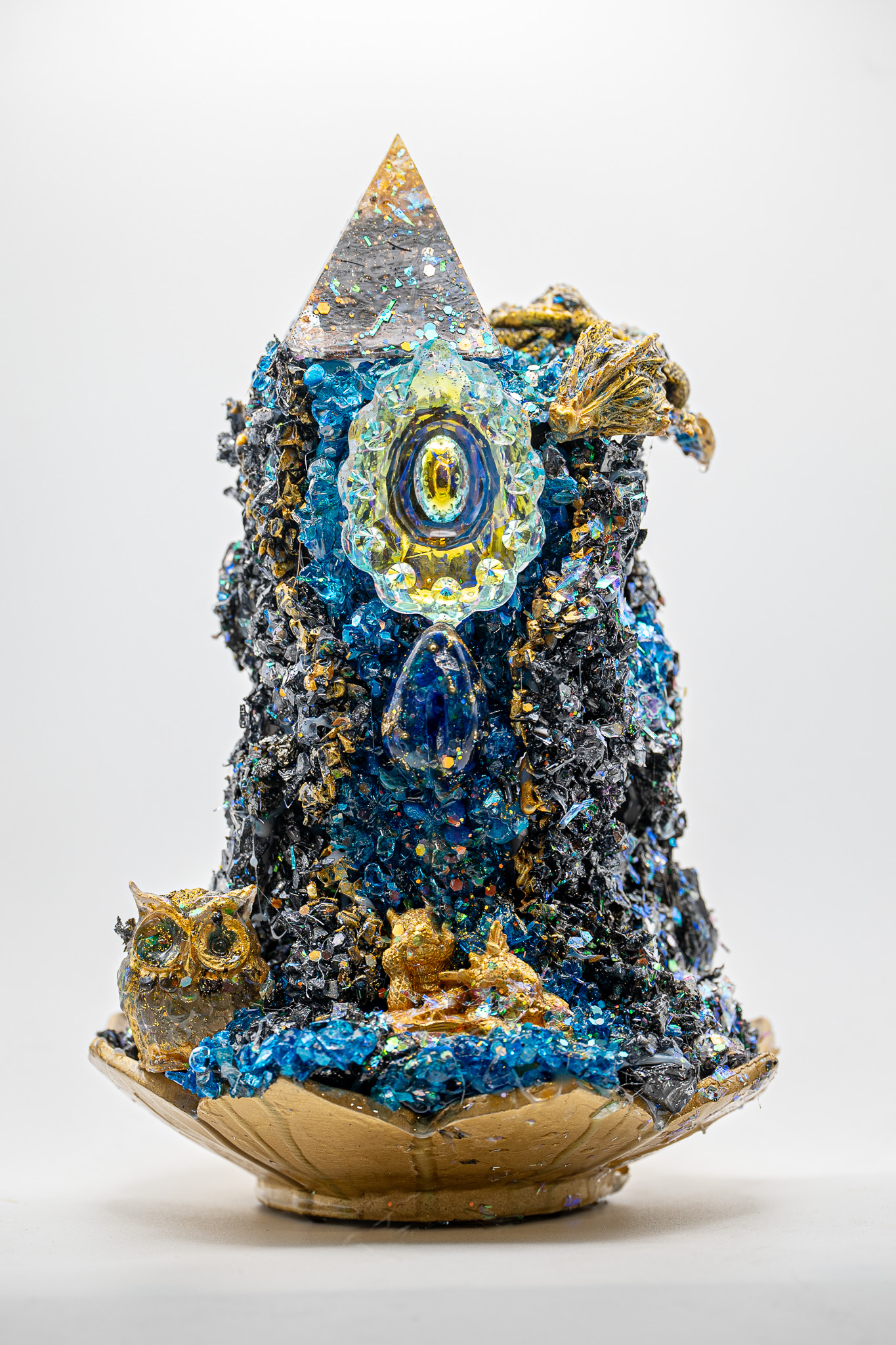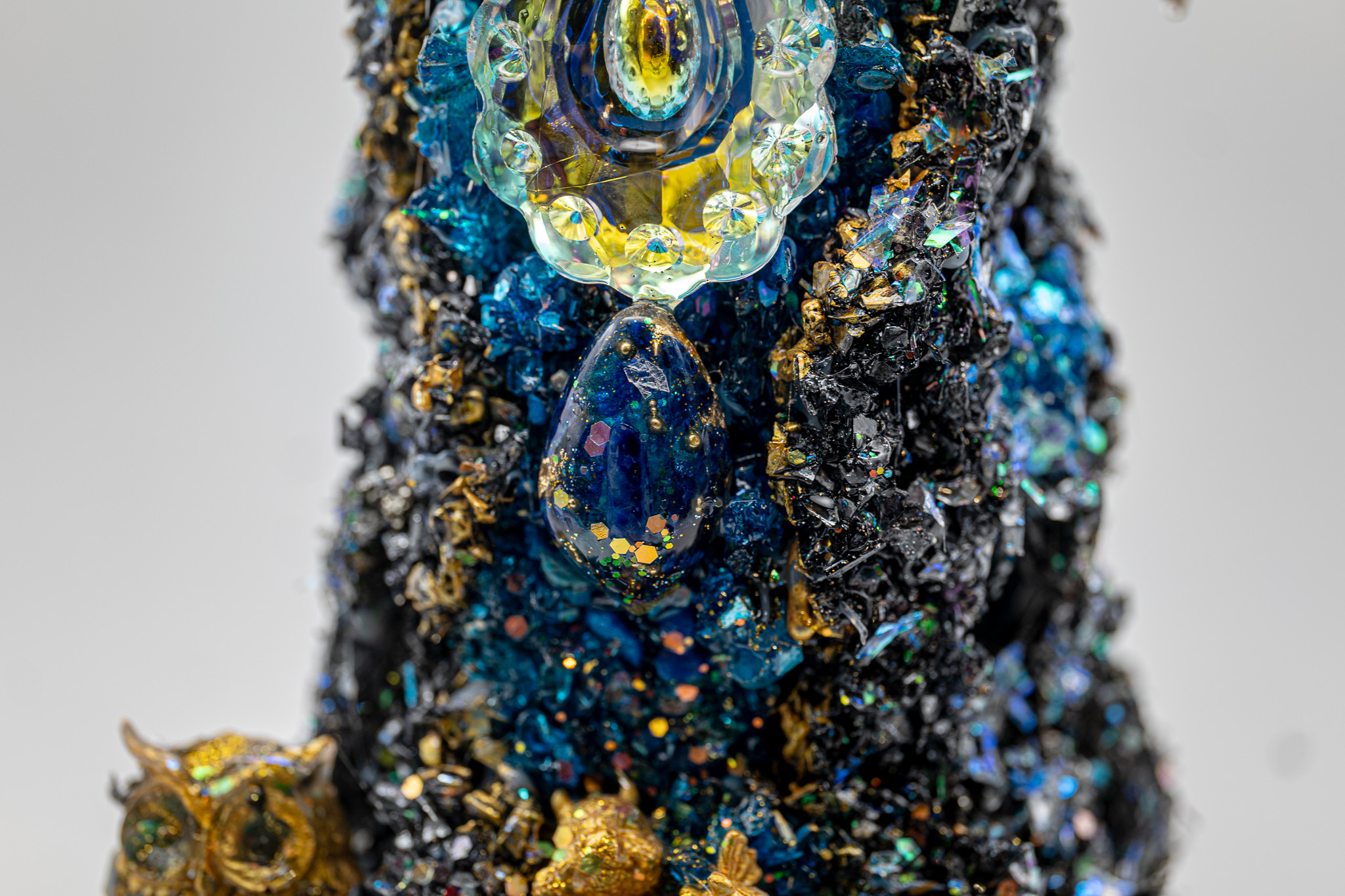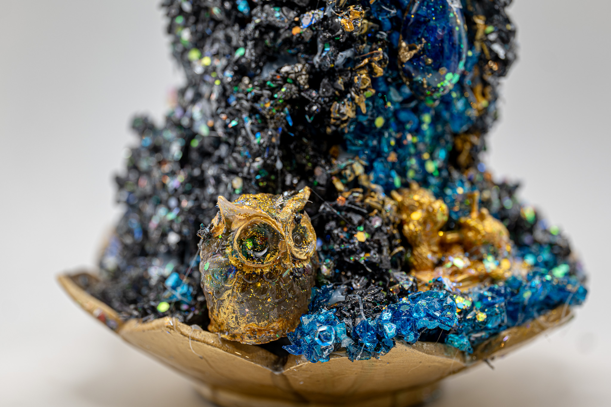 • Eine Eule aus Epoxidharz, gefĂĽllt mit Kristallen.