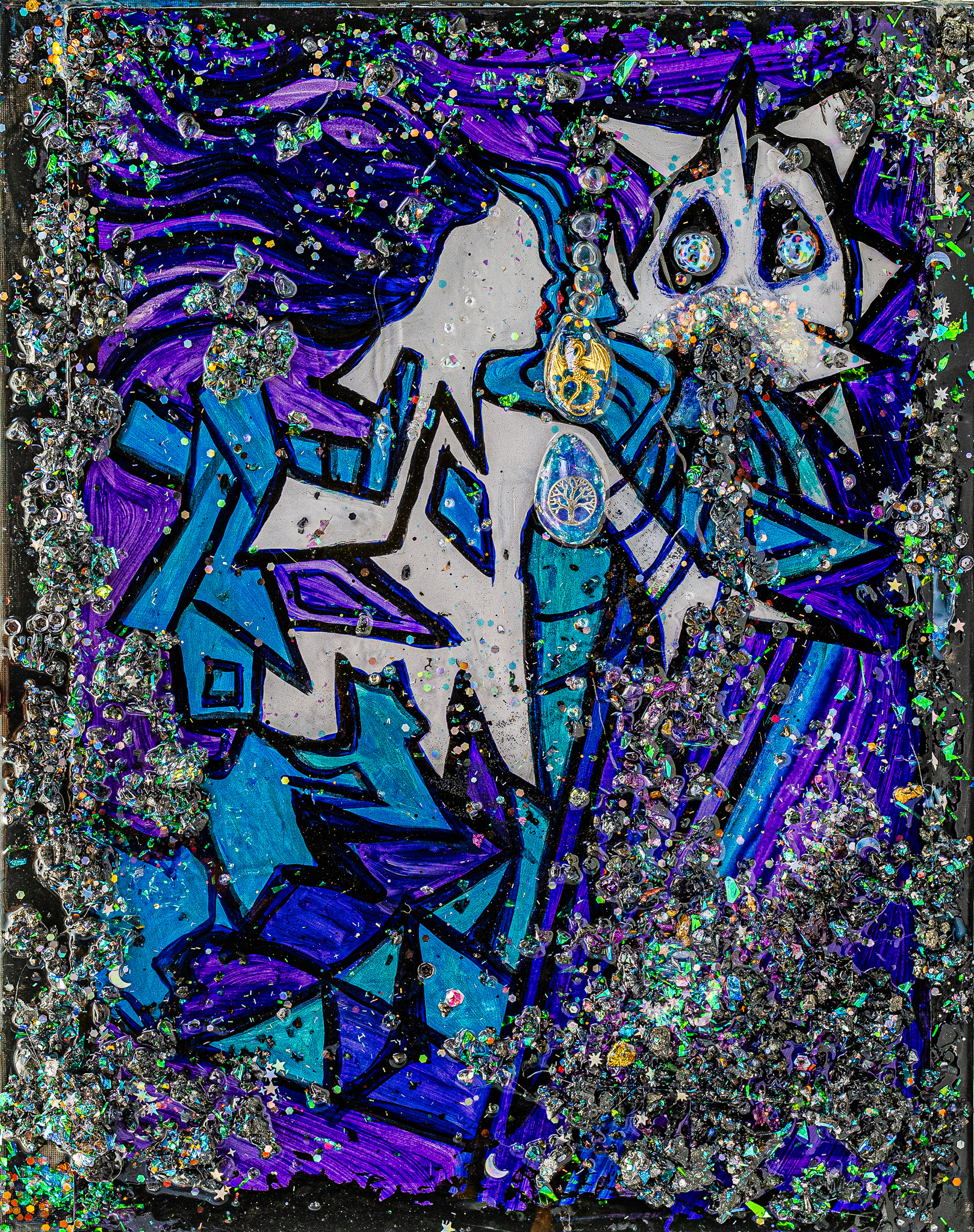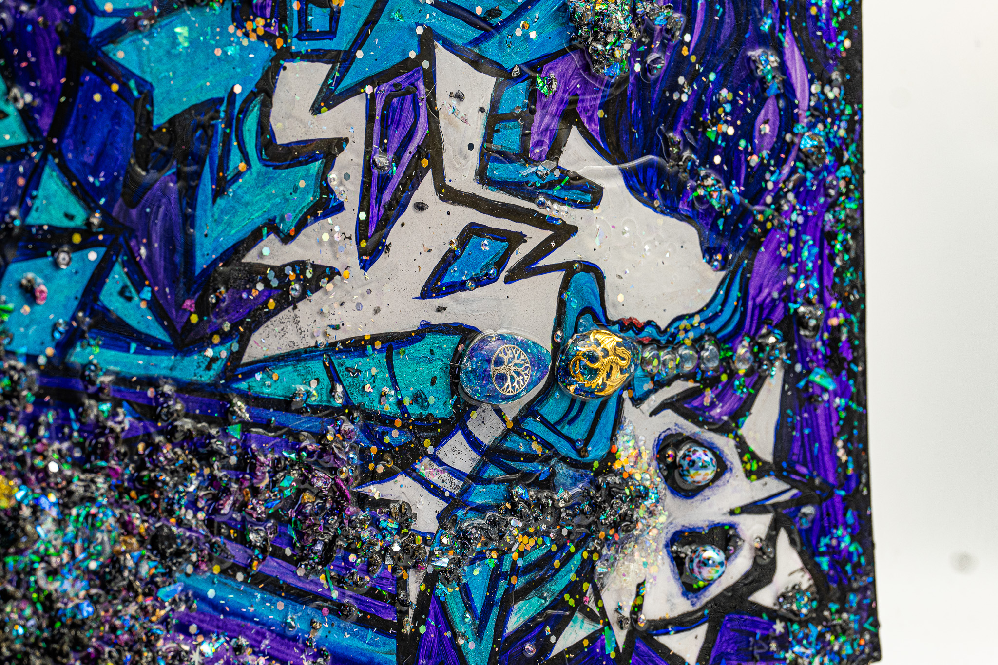 Verarbeitet sind schwarzer Turmalin, Bergkristall sowie zwei Orgonit-Pranatropfen, eingebettet in eine vielschichtige Acrylmalerei. Die Oberfläche ist reich an Struktur und feinen Lichtpunkten, wodurch das Werk je nach Blickwinkel unterschiedlich wirkt – mal geschlossen, mal durchlässig, fast körperlos.