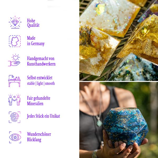 Like every Oz orgonite, the PranaCrystal® harmonizes its environment with positive Chi (Prana, life energy). Due to its pyramid shape, a PranaCrystal®is particularly suitable for harmonizing living and working spaces. A PranaCrystal® is constructed according to sacred geometry. With a PranaCrystal® you get a mini Cheops pyramid into your house, whose harmonic field supports you and your environment positively. Due to their aesthetic appearance, they are also an eye-catcher in any environment.
