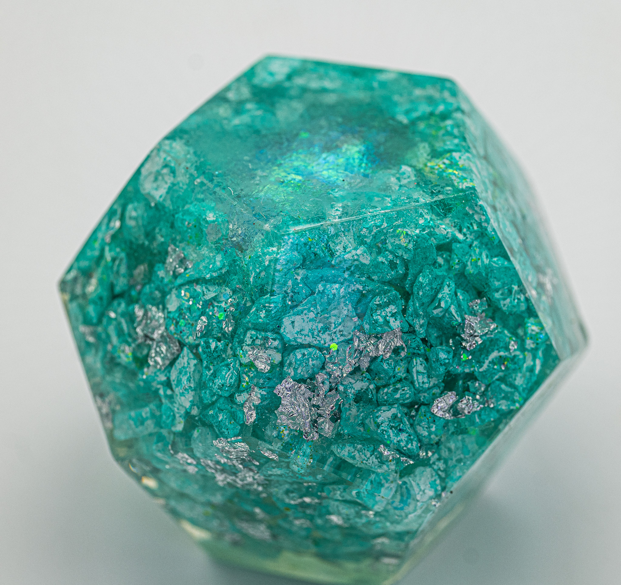 Das organische Harz zieht Energie aus der Umgebung an. Beim Aushärten schrumpft es und erzeugt konstanten Druck auf die eingebetteten Metalle und Kristalle – ein piezoelektrischer Effekt, der das Energiefeld aktiviert.
