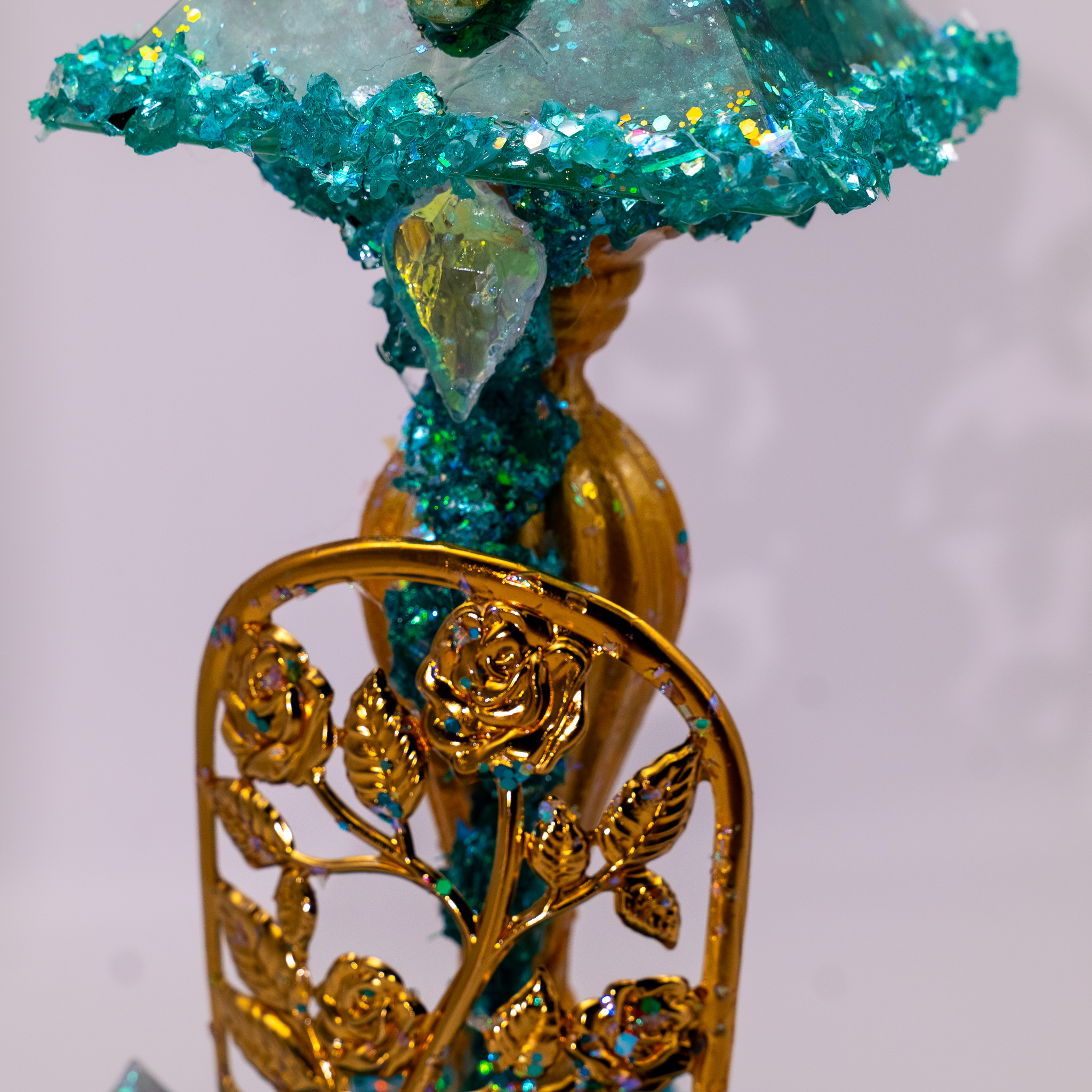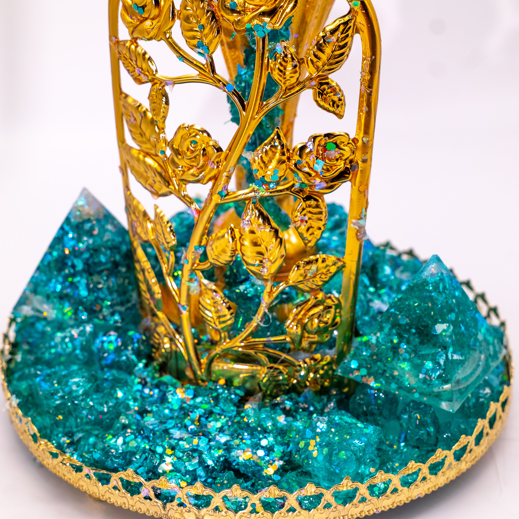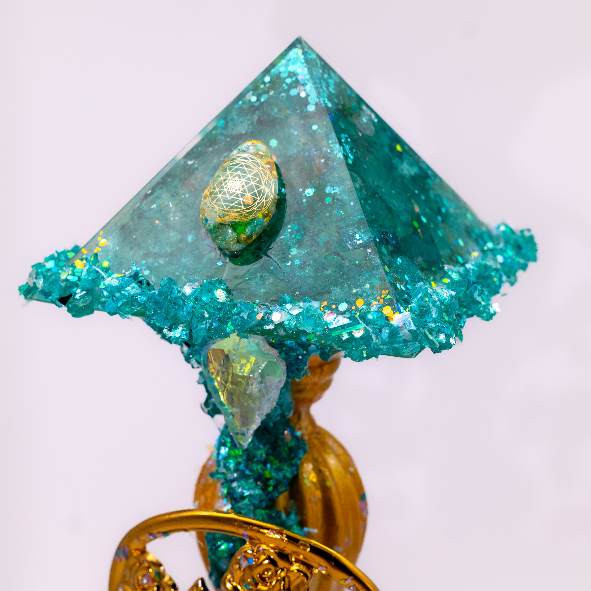 Materials: Gemstones, orgonites, clear quartz, gold leaf
